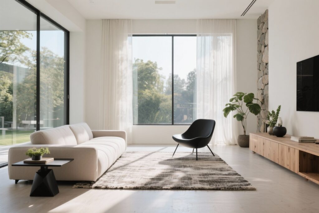 Let light be the star: floor-to-ceiling sheer curtains, white microcement floors, and a slim white sofa on slender legs. A simple pedestal coffee table keeps sightlines clean.