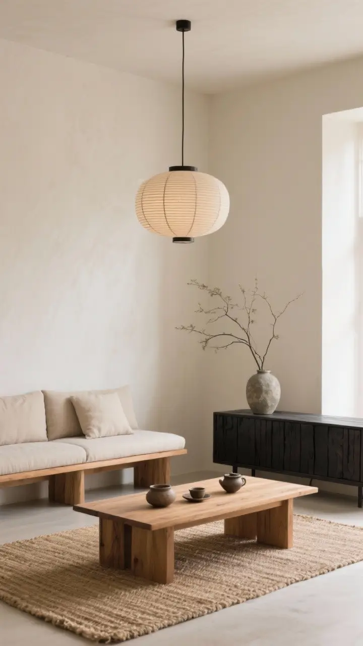 Choose a low-profile paper lantern pendant, a slatted wood coffee table, and a woven jute rug. Keep decor to a few branches in a stone vase and a hand-thrown tea set.