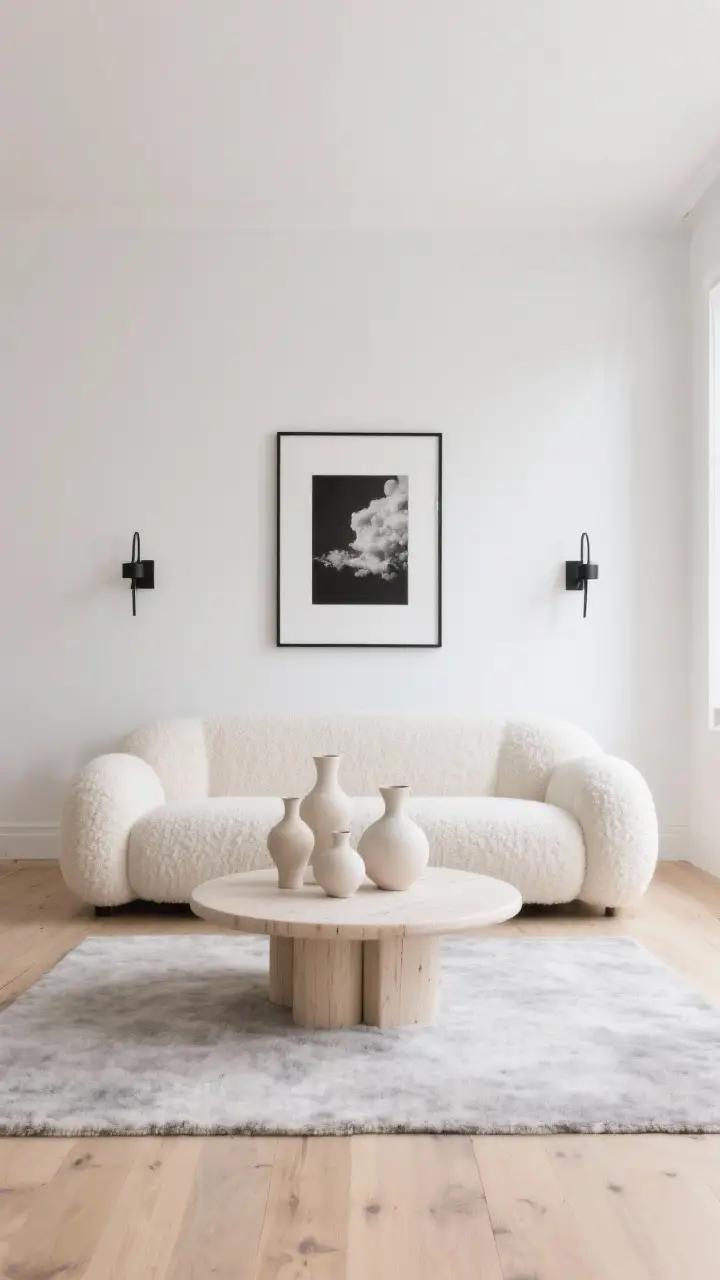 Think soft white walls, a pale oak floor, and a low, cream boucle sofa that looks like a cloud. Add a round, whitewashed wood coffee table and a light gray wool rug for warmth.