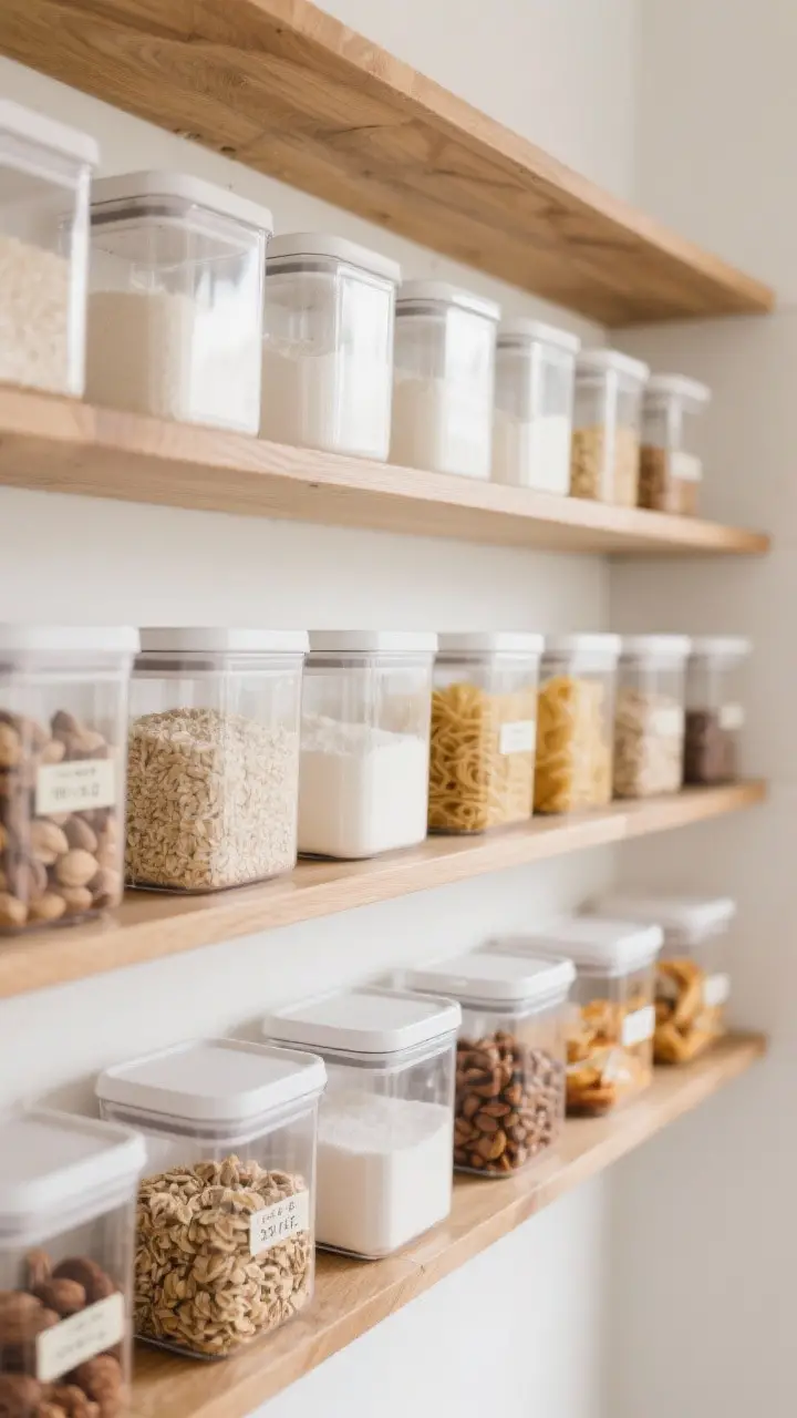 Those cereal boxes and half-open pasta bags? Visual noise. Pour your pantry MVPs into clear, airtight containers so you can actually see what you have.
