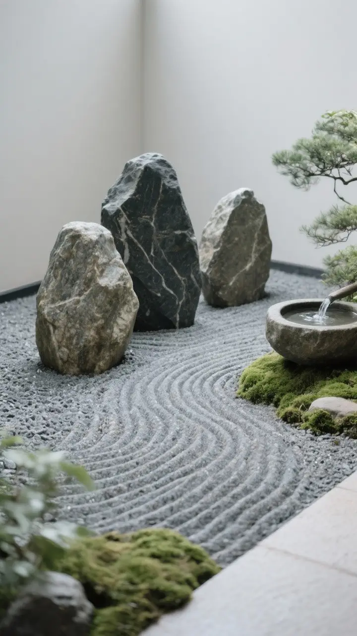 Water should feel subtle and ancient, not like a hotel lobby fountain. Think tsukubai (stone basin) or a small bubbling spring you can barely hear over the birds.
